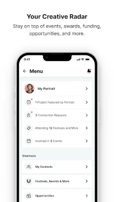 * Industry Pocket Guides: Browse industry attendees, see portfolios of people behind the films, send messages, set meetings, and add senior contacts. See who you know on Portrait via easy phone contact sync.